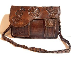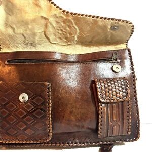 This elegant handcrafted leather bag features intricate floral designs, perfect for adding a touch of sophistication to any outfit. The rich brown color complements a variety of styles.main compartment 2 pockets at interior wall 3 pockets at front flap open pocket at back lining have some stains exterior have some marks scratches creasing hight 8” wide 13” depth” strap drop 19”The dimensions are based on approximately measurements before placing an order please check take a moment to view all photos using feature for a closer look