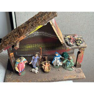 Vintage Handcrafted Nativity Scene With Figurines & Rustic Wooden Stable 12 x 10