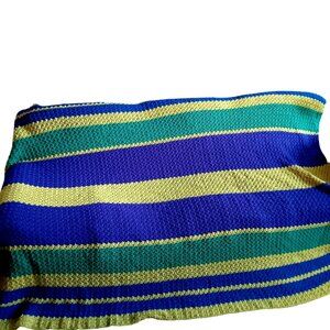This vintage knit blanket offers a nostalgic charm with its vibrant stripes in green, yellow, and blue. Its handmade quality reflects a bygone era of craftsmanship, evoking memories of cozy evenings. This piece not only serves as a functional cover but also as a decorative accent, adding warmth to any room's ambiance.