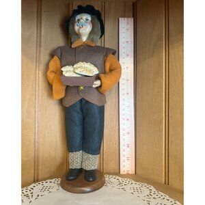 This handcrafted figurine combines ceramic and fabric materials, showcasing a farmer holding a bread tray. Its intricate details add charm to any decor. Makes a perfect display for Thanksgiving.