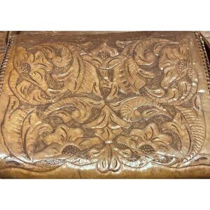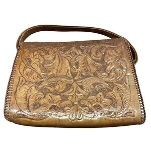 This vintage leather handbag features intricate floral tooling, showcasing exquisite craftsmanship. A brass turn-lock closure secures its contents, combining functionality with timeless style.