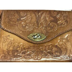 Vintage Handcrafted Tooled Leather Handbag With Florals Brass Turn Lock Closure