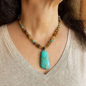 Elevate your everyday style with this one-of-a-kind handcrafted necklace featuring a striking turquoise pendant and a rich mix of natural stone chip beads. The 20-inch length sits gracefully at the collarbone, making it perfect for layering or wearing solo.