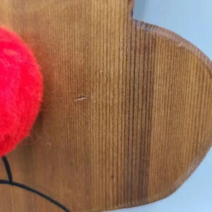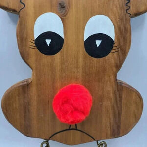 Vintage Handmade Rustic Primitive Wood Carved Christmas Reindeer Rudolph Welcome Sign. Rudolph-the-Red-Nosed Reindeer decorative welcome sign. Handmade wood carved and hand painted. Red pom pom nose. Welcome sign hangs on attached hooks and is removable. A notch is carved in the back for hanging. In very good condition with a small mark on the face and couple of rubs in the wood as pictured. Vintage 1994 as signed on back. Great for natural, primitive, rustic, cabin decor.
