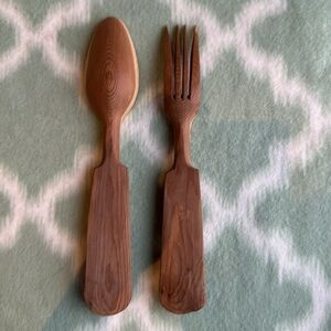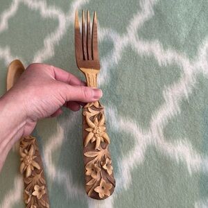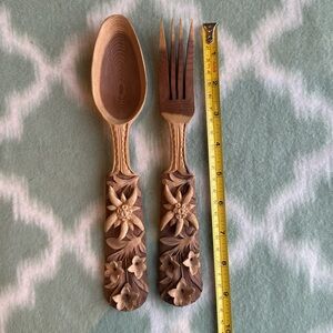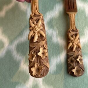 They are a beautifully handcrafted wooden spoon and fork set. Featuring intricate floral designs in high relief. They are a single piece of wood. These are likely from the Black Forest region of Europe. The hardwood grain details are natural and amazingly beautiful.