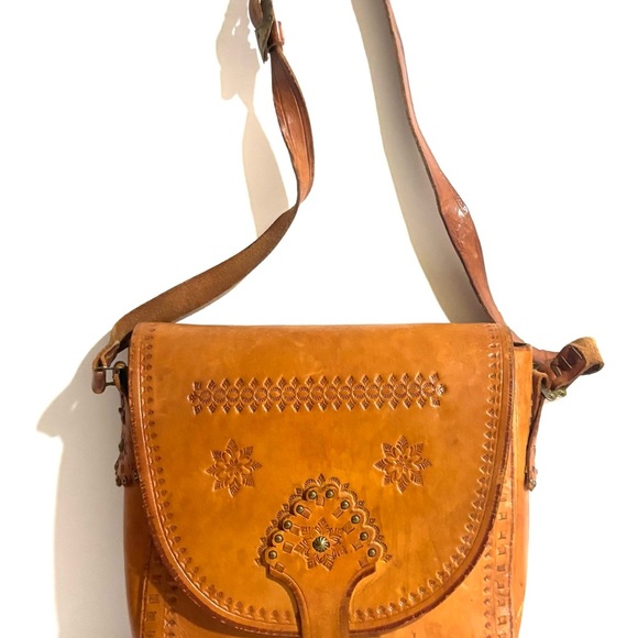 This beautifully handcrafted tan leather crossbody bag is perfect for any occasion. Its intricate design and durable material make it a stylish and practical choice. Main compartment 1 open pocket at interior wall raw suede lining open pocket at flap lining have some stains exterior have marks scratches side have minor cracks hight 10” 10” depth 2.5” strap drop 21” adjustable The dimensions are based on approximately measurements before placing an order please check take a moment to view all photos using feature for a closer look