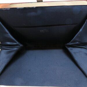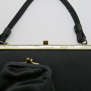 Vintage Women After Five Black Satin Evening Handheld Purse Bag Mother of Pearl Frame. Satin material with clasp closure. Iridescent mother of pearl frame adorns the front. Lined interior with one slot and an attached kiss lock coin purse. Single top handle is attached securely to frame. Exterior satin material has marks and tiny snags here and there. Back of metal frame has slight white glue residue, tarnish and scratches. The back frame was mended to correct misalignment. With this adjustment exposed few staples on the interior. Interior has tiny marks to the lining. Some flaws to this vintage piece. Still plenty life left to carry or display with your collection.