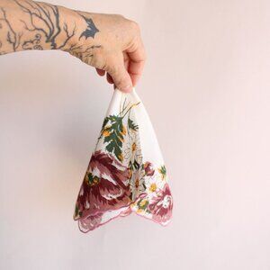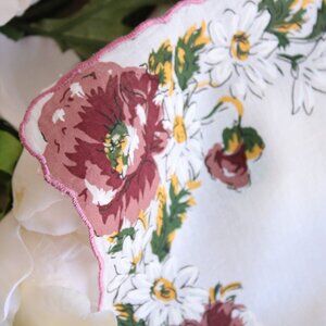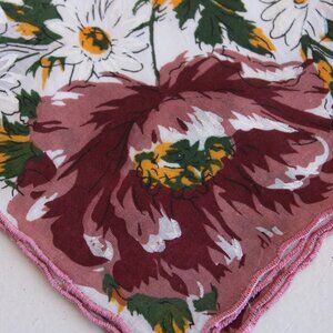 Charming vintage hankie in white cotton with a lovely print of flowers in brown and yellow with green leaves. Scalloped edges. Approx 12" square. No labels or marks. Perfect for any hanky collector!