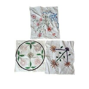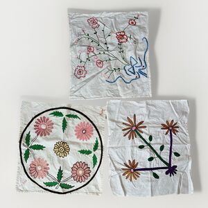 Set of 3 vintage embroidered floral linens each with unique hand-stitched patterns and charming old-world character. Perfect as small table toppers, decorative textiles, or repurposed for sewing, quilting, or cottage-style home decor.