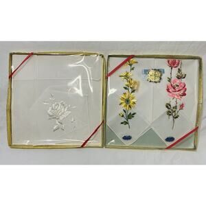 Vintage handkerchief lot of 4, comprising two white embroidered and two pink and yellow. Crafted from fine white cotton with delicate hemmed edges. The colored ones are labeled "Made in Switzerland," while the white ones lack specification. A charming collection offering nostalgic elegance and international flair.