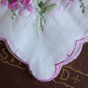 Gorgeous vintage handkerchief embroidered with pink pansy flowers and with pink scalloped edges. Feels like a cotton or cotton linen blend to me. Measures about 10.5" square. Probably 1950s or so.