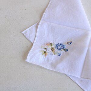 Lovely little white cotton hanky. Floral embroidery of mostly blue roses with green leaves and other little yellow flowers in one corner. Measures approx. 10.25" square.