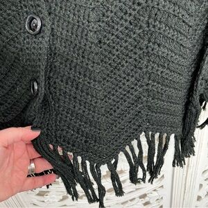 Vintage Hand-knit Black Open Stitch Poncho in excellent condition - gently worn with no flaws. Gorgeous hand knit with open stitch and fringe. Large black buttons down front and knit collar. Will work on a size Small or Medium best.