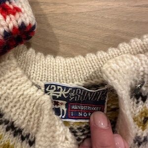 Small hand knit wool Norwegian Sweater for kids by Sundt. Has metal buttons. Matching hat. Pit to pit measures 13". I'm guessing a 4 - 8 year old could wear it.