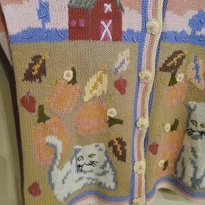 Vintage Handknits by Storybook knits cat and pumpkin knit button-down sweater in size medium. This sweater has 3 cats, a barn, trees, multiple pumpkins, fall leaves, flowers, and a sunrise or sunset hand knitted on it with flowers for buttons. There is a small pull on the inside of the sweater below the tag. There are small, untreated spots on the right arm and a couple of the flower buttons, but otherwise, it is in excellent condition. The cats on this autumn cat sweater were made to have a fuzzy texture.