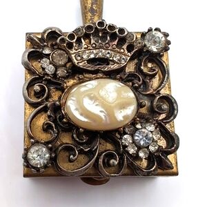 Vintage Handled Gold Tone Snuff / Pill Box with Rhinestones & Faux Pearl on Lid