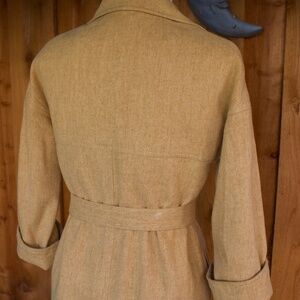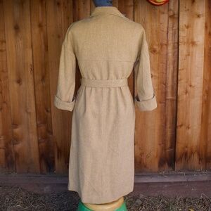 No label of any kind, but for certain the exterior is 100% wool. The inside layer is a soft material most likely polyester. This coat-like shirt dress has pockets, and is incredibly chic. Sleeves are a bit shorter than a full length sleeve, and looks great with a cuff at the forearm. The collar and overall style of this dress appears to be made in the 70's or older. Perfect condition, no sign of wear. I have another vintage coat dress similar to this one, belted 100% wool. Such a unique statement piece to add to any wardrobe. Single box pleat at the front skirt, and a chest pocket for good measure.