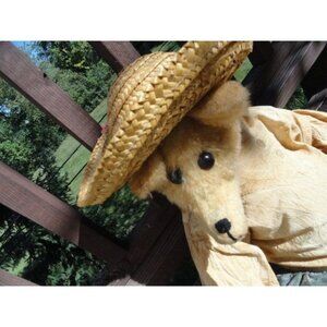 Vintage Handmade 20″ Teddy Bear Full Brim Straw Hat Flowers Denim Dress Red Bow