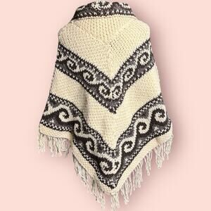 Vintage Handmade 60s Fringe Southwestern Aztec Poncho Shawl Chunky Knit Boho Pom