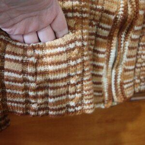 A cozy vintage handmade cardigan with rich 1970s character. This chunky knit sweater features a plaid front in shades of brown, tan, and off-white paired with solid cable-knit sleeves for a textured, layered look. The zip-up front and two front pockets add both style and function, while the ribbed cuffs and hem give it a classic, comfortable fit. Perfect for cold weather layering or retro-inspired outfits, it captures the warmth and craftsmanship of true handmade vintage knitwear.
