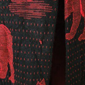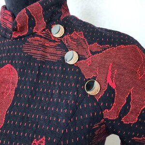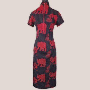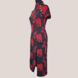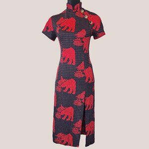 Vintage Handmade Asian-Inspired Dress Red & Black Bear Print Front Leg Slit