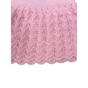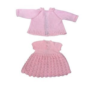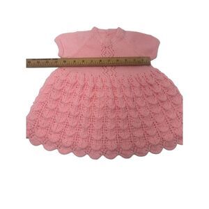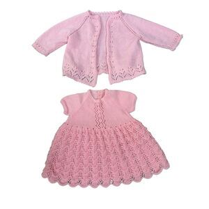 Beautiful handmade baby outfit featuring a soft pink knit dress with a matching cardigan. Delicate lace pattern with scalloped edges throughout. The craftsmanship shows skilled hand knitting, making this a one-of-a-kind piece. Perfect for special occasions, portraits, or gifting.