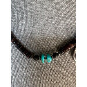 This vintage handmade necklace features a striking teardrop pendant with a detailed eagle design. The intricate beadwork showcases a combination of brown and turquoise beads, adding a touch of bohemian flair. Ideal for those who appreciate unique, artisanal jewelry pieces that tell a story.