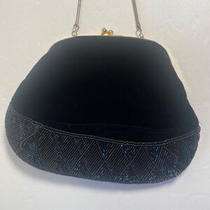 Elegant and timeless, this handmade black velour evening bag features a soft velvety body accented with intricate black beaded detailing across the lower front. The purse has a classic kiss lock closure with a gold-tone metal frame and a matching gold snake-style chain strap that can be stored inside for use as a clutch.Perfect for formal occasions, weddings, theater nights, or vintage fashion lovers.✨ Details:Color: BlackMaterial: Velour fabric with glass beadingFrame: Gold-tone metal with kiss-lock closureStrap: Gold-tone snake chain (tuck-away style)Interior: Black satin lining with inner slip pocketTag: Hand Made in ChinaEra: Likely 1980s–1990sCondition: Excellent vintage condition — minor age-appropriate wear only📏 Measurements:Width: 8"Height: 6.5"Strap drop: 22"🎀 A lovely blend of vintage charm and handmade craftsmanship — ideal for collectors or anyone who appreciates elegant evening accessories.