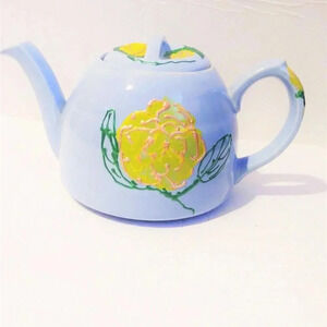 Vintage Handmade Blue Teapot. Light blue in color with yellow flowers on each side of teapot, the handle and on the lid.
