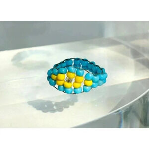 Adorable little blue & yellow beaded ring. This ring is handmade. The ring is made with wire and tiny beads. There is one center clear bead.