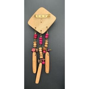This vintage handmade boho natural beauty wood dangle brooch is a unique and artistic piece of fashion jewelry. The multicolor wooden dangles create a bohemian and nature-inspired design that is sure to add a touch of beauty to any outfit. The natural materials and vintage craftsmanship make this brooch a standout accessory for those who appreciate artistry and individual style.