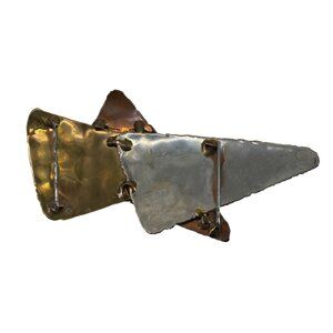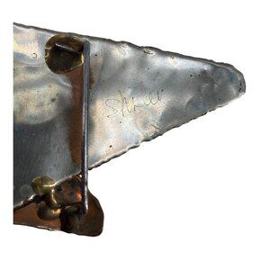 This Vintage Handmade Brutalist Mixed Metal Triangular Belt Buckle is 3.5” and features a unique blend of bronze and silver tones. The piece is artist-signed, adding an authentic touch to its rustic Brutalist style.