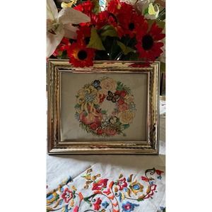 Vintage Handmade Butterfly Wreath Cross Stitch Gold Framed Wall/Stand Decor