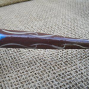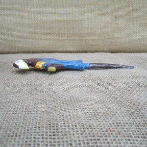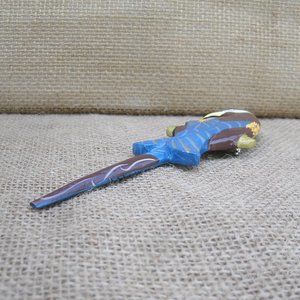 Vintage handmade parrot pin from 1980s. Hand carved and painted wood. Standard locking pin on back. Brown, blue, white, yellow, with nice gold and red details. Large size: 6 inches high, 2 inches wide. Good condition, no chips or cracks. Paint intact. Great for anyone who likes parrots/birds. Very unique.