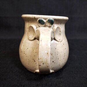 This Vintage Handmade Ceramic Mug has a subtle speckled gray glaze with an adorable elephant-like face on the handle with thumb rest ears on either side. It measures 3.5 inches in diameter, 3.5 inches in height, and 4.5 inches wide with the handle. Please note this is a hand made studio pottery piece and therefore does not have perfect dimensions. There is also a spot on the front of the mug where the glaze did not fully catch as well as a drip of glaze down one side. Please see images for details.