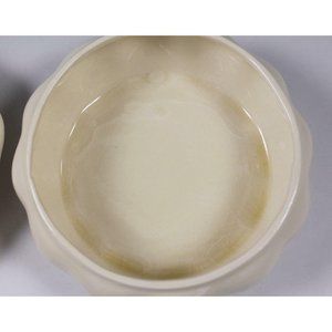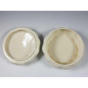 Item has overall crazing in the glaze. There is also some discoloration on the inside and some chips or nicks under the glaze. There is a rough spot on the bottom of the dish which looks like a dark speck that was fused to the piece during firing, as well as another one on the inside rim of the lid. Please see all photos for condition.