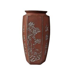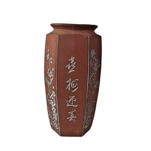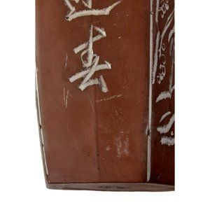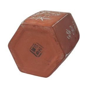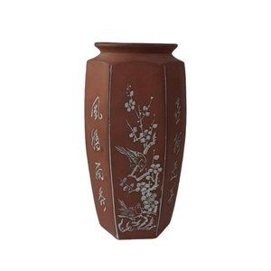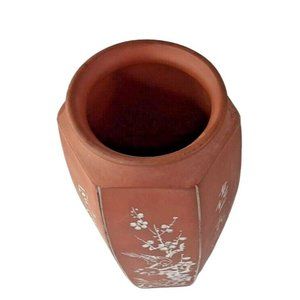 Vintage Handmade Chinese Vase Birds Floral Design Pottery Red Brown Hexagon 8.5"