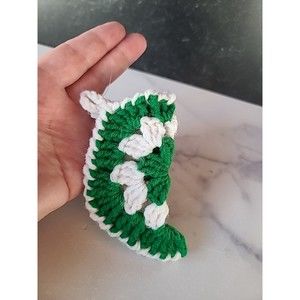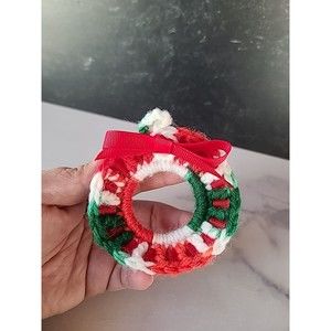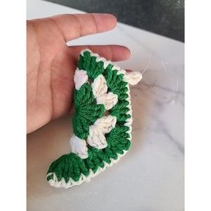 This is a set of 2 handstitched yarn ornaments, one in the shape of a wreath, the other in the shape of a stocking.