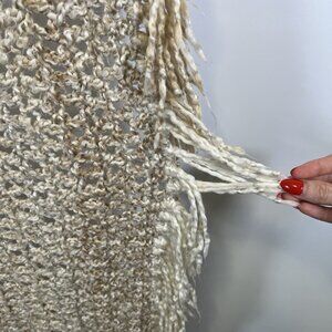 Bold handmade open-weave throw blanket in vibrant cream/beige with long fringe ends.