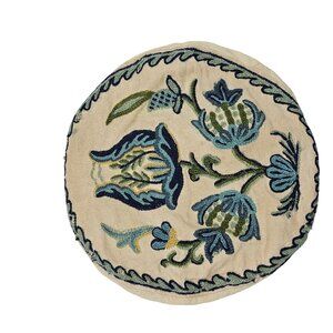 Vintage Handmade Crewel Embroidery Round Pillow Cover 12" Blue Thistle Design