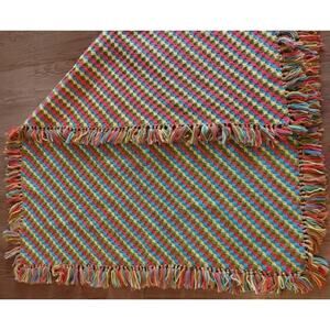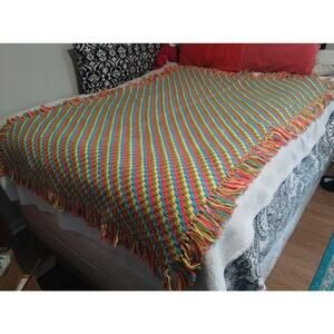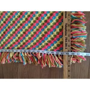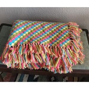 Vintage Handmade Crochet Afghan Blanket Blue Green Pink Yellow Neon 68”x 51"