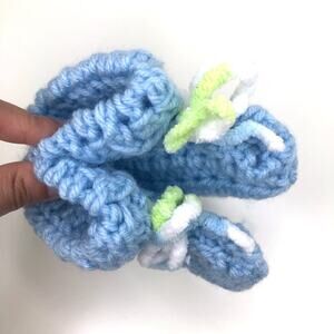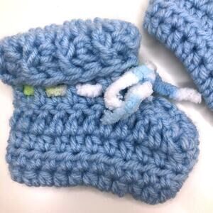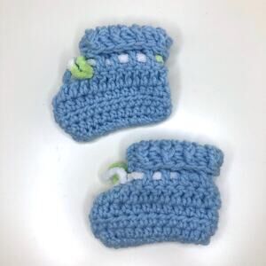 Cute classic crocheted baby booties in light blue with fuzzy multicolored tie detail. Would be so cute for a newborn baby photoshoot!