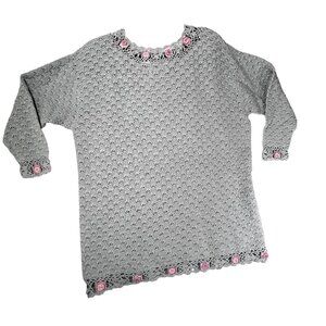 Vintage Handmade Crochet Green Tunic Sweater Pink Roses Colleens Collectables