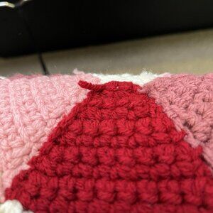 Beautiful handmade crochet blanket featuring bold hexagon motifs in shades of pink, red, and white.