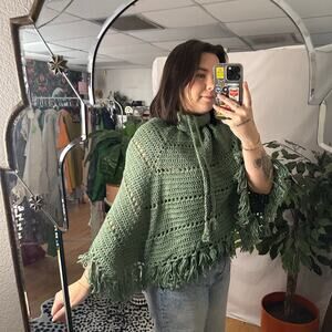 Vintage Handmade Crochet Knit Cozy Poncho Fringe Green Small