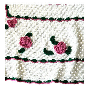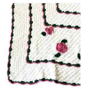 Vintage Handmade Crochet Open Weave Blanket 3D Flower Rose Cottagecore Fairycore