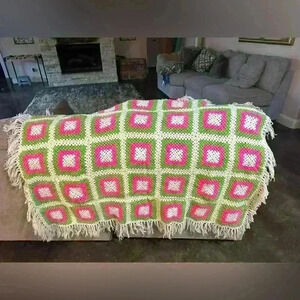 Vintage 54” x 38” handmade hot pink and neon green crochet square granny throw. The fringe on the afghan makes it extra special!