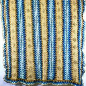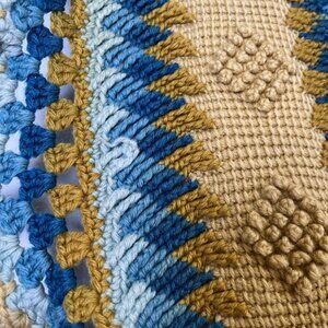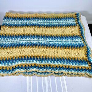 Vintage Handmade Crochet Throw Blanket Blue & Mustard Geometric Afghan MCM Boho