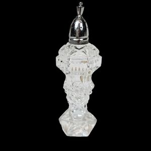 Features gorgeous hand cut crystal salt shaker, silver top, pedestal base, geometric cut, handmade in Germany, Victorian style, hollywood regency, vintage crystal salt shaker.