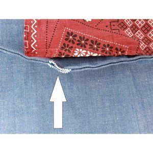 Vintage Handmade Denim Bandana Bib Apron from the 1970s. Features Red Bandana Pockets and adjustable neck and waist ties.
